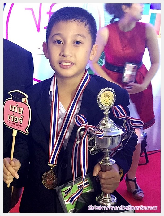 - ด.ช.ก้องภพ ปิยะกมลานนท์ ป.6/7 ได้รับรางวัลเหรียญทองและถ้วยรางวัล The highest score of both part.